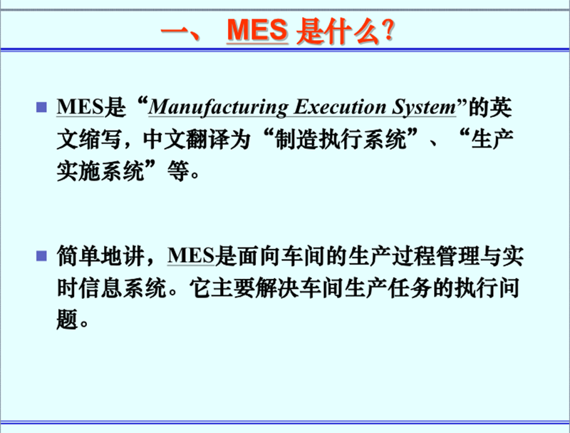 一、MES 是什么?二、为什么需要 I MES ? 三、MES能够做什么?四、MES 在国内外的发展与应用情况五、MES能给企业带来什么?六、企业如何实施 MES ?七、MES 实施案例八、我们正在做什么?
