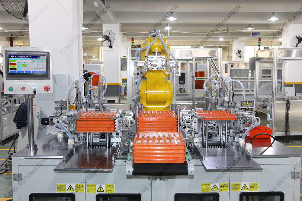 具有自动上料、触头装配、CCD视觉检测、自动摆盘、码垛、AGV物流、缺料/满料报警等工序的装配、在线检测、