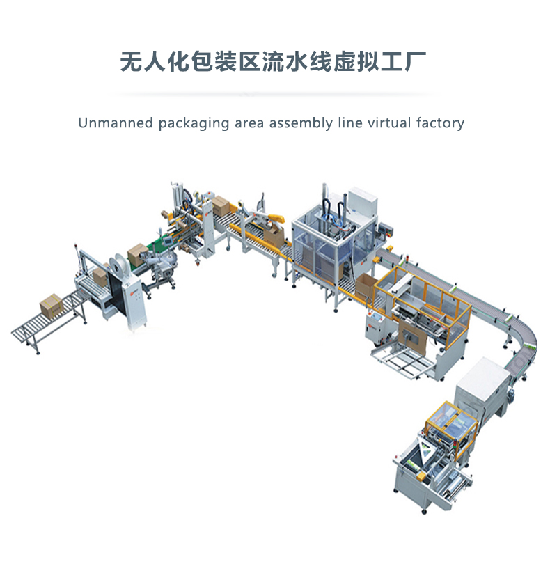 人工放料或其他包装设备出料口自动放料,自动封箱。