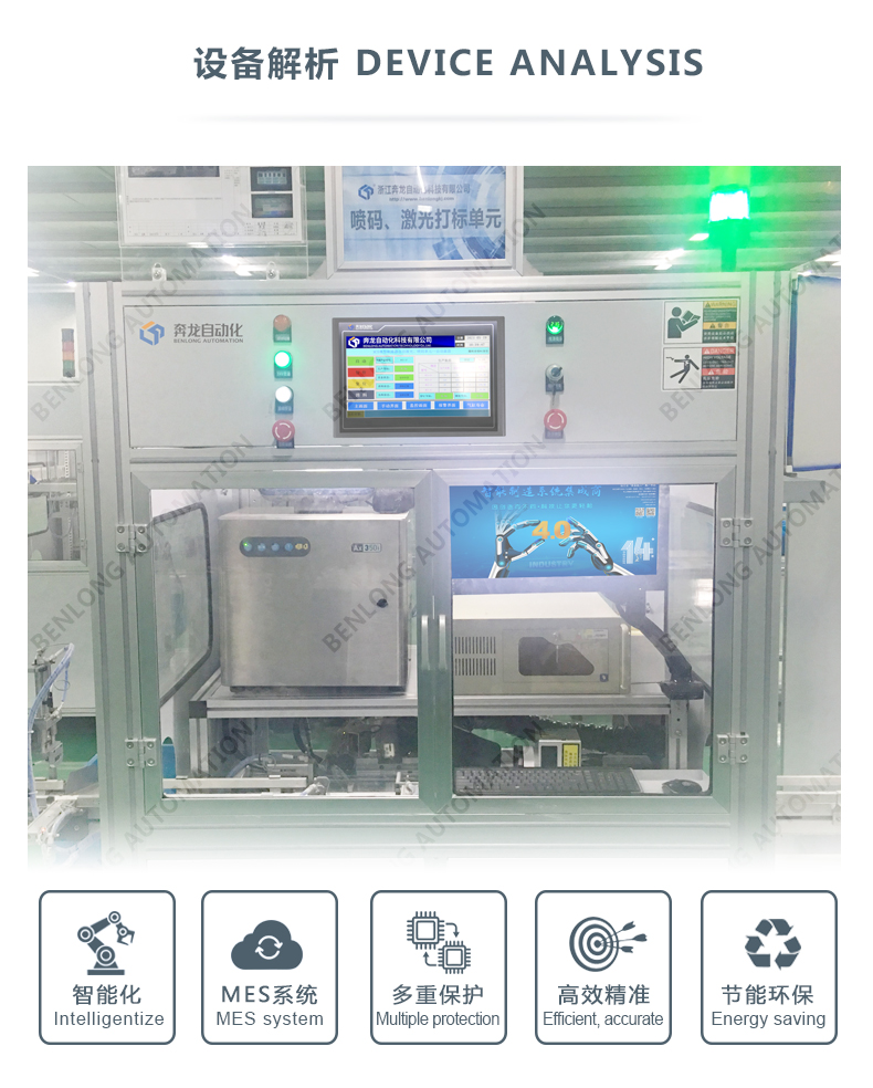 具有自动激光打标二维码、喷条形码或产品ID码、CCD检测、不良品区分、缺料报警、竖立翻转水平、水平翻转竖立等工序的在线监测、