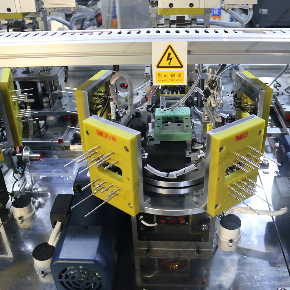 具有自动上料、插芯装配、底座装配、主辅静触头装配、人工装配宝塔弹簧、锁上下盖螺丝、锁瓦片螺丝、通断、耐压、功耗、前倾吸合、