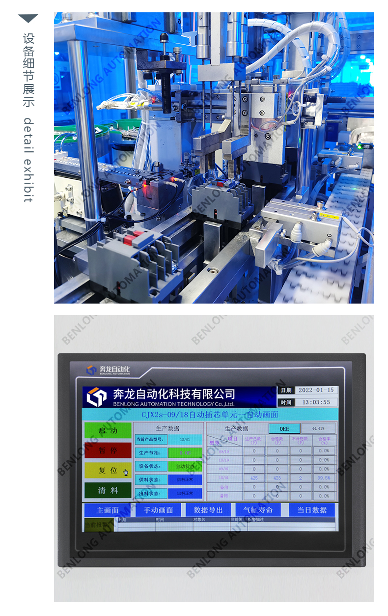 具有自动上料、插芯装配、底座装配、主辅静触头装配、人工装配宝塔弹簧、锁上下盖螺丝、锁瓦片螺丝、通断、耐压、功耗、