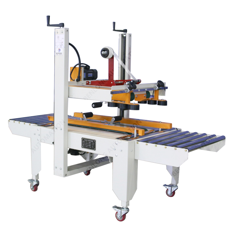 人工放料或其他包装设备出料口自动放料,自动封箱。
