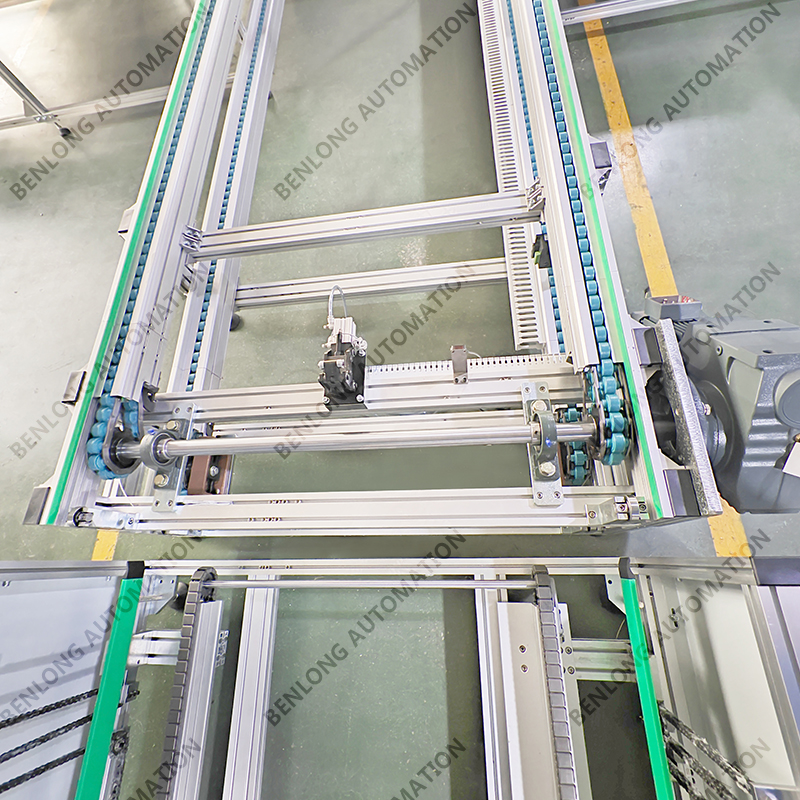 1、整个生产线主要分三段控制,分别为装配区、待检区、检测区,三段独立控制,采用链板线传动,每段速度可调,调整范围在1m~10m/min;
